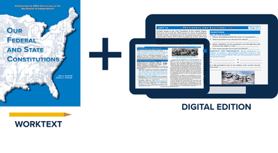 For orders of 20 or more student copies, digital tools and assessments that accompany the student worktext are available at no charge. The digital activities include end-of-unit questions and the final federal and state testing program. All direct-answer questions (multiple-choice, true/false, and matching) from the student worktext have been set to auto-grade, saving teachers time from grading individual responses and using valuable class time to review the correct answers. The platform has been built using Google Forms to provide teachers with an easy-to-use, customizable interface that integrates directly with any online platform. To request more information or gain access to these digital tools, please get in touch with our offices (info@ajspublications.com or 847-526-5027).