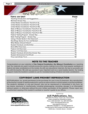 Teachers' materials include an answer key, testing program for both the federal and Missouri units, an updated government officers sheet listing your state and federal officials, and a Constitution Pocket Guide. Also included are Extra effort student exercises are an approach to critical thinking that involves investigating a narrow topic, researching and studying the evidence, and communicating conclusions. These exercises are included in the teacher guide, along with additional handouts, testing program, and an answer key.
