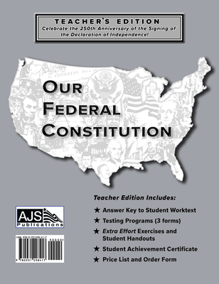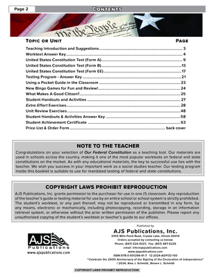 Teachers materials include an answer key, three-form testing program for the United States Constitution, an updated government officers sheet listing federal officials, a copy of the U.S. Constitution, and handouts on current topics in the news along with student exercises.